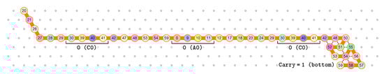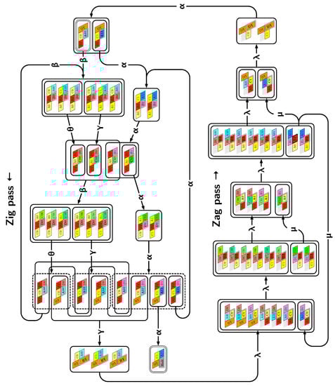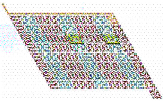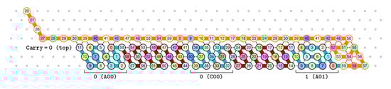 In the zag pass (→), modules A and C “read” the bricks above A or C and folds into the bricks that encodes the corresponding bits, namely Ay or Cy where . There are no carry propagation and all the modules B and D fold into the same brick B2 or D2 in this pass.