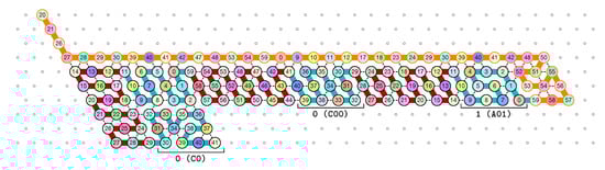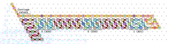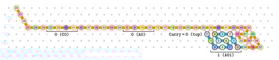 The first zig pass (←). Each zig pass starts with a carry equal to 1, i.e., starts folding from the bottom row. In the first zig pass, the first module A (see Figure 6) folds into the brick A01, encoding the bit with no carry propagation, as a consequence of the carry being 1 and of reading the first bit, 0, from the seed above. Note that the folding A01 ends at the top row, encoding that the carry is now 0. The reading of the bit from the seed is accompl details in Section 3.3.