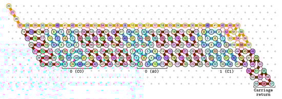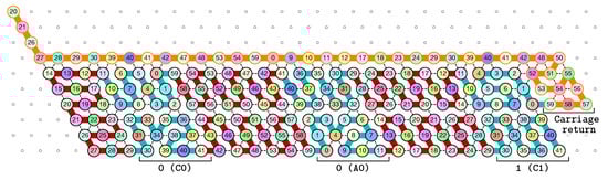 Note the symmetry by a shift of 30 of the beads values in the patterns involving Modules A and C, and Modules B and D. - The last part , made of beads from Module D, encodes a sequence that will first initiate the next zig pass and later trigger the carriage return at the end of the next zag pass.