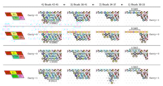 - Module C (beads 30–41, in blue in all figures): the Second Half-Adder