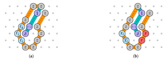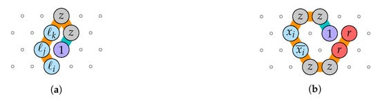 The polynomial-time reduction for 3-SAT to the rule design problem for delay . The seed configurations are linked in orange, and the target configurations are linked in turquoise. (a) The seed-target configuration pair for clause : it is deterministically foldable iff 1 is attracted by at least one of ; (b) The seed-target configuration pair for variable : it is deterministically foldable iff 1 is attracted by r and 1 is attracted by at most one of z, and .