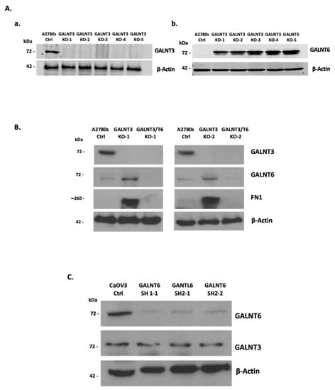 Western blot protein expression analysis of GALNT3 KO and GALNT3/6 KO clones. (A) The CRISPR/Cas9 system was used to generate GALNT3 KO (GALNT3 KO) clones in the A2780s cell line. Five clones show complete protein ablation upon GALNT3 KO (a). Similarly, Western blot confirms the compensation by GALNT6 in the GALNT3 KO clones (b). (B) Western blot analysis of the double KO clones (GALNT3/T6 KO-1 and GALNT3/T6 KO-2) generated using the CRISPR/Cas9 system followed by the shRNA system; mock transfected A2780s cells were used as the control clone (A2780s Ctrl). FN1 was also evaluated in these clones, confirming the activity and expression of GALNT6 in the single GALNT3 KO clones. (C) Western blot confirmation of shRNA-mediated GALNT6 KD in the CaOV3 cell line, in addition to GALNT3 protein expression analysis in the CaOV3 Ctrl and GALNT6 KD clones. β-actin was used as the loading control.