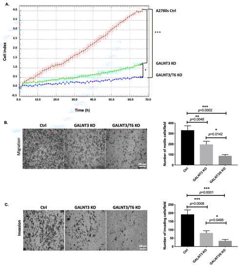 Multiple functional assays were employed to compare cancer-related phenotypic changes acquired in EOC cells upon knocking out one (GALNT3) or two members (GALNT3/T6) of the GalNAc-T family. One GALNT3 KO A2780s clone (GALNT3 KO) and one GALNT3/T6 double KO (GALNT3/T6 KO) A2780s clone were selected for further functional analyses. The impact of the GALNT3 KO and the double GALNT3/T6 depletion was investigated on A2780s cellular proliferation, migration, invasion and cell cycle control. As expected, the GALNT3 gene ablation led to a sharp significant decrease in A2780s cellular proliferation (represented by the cell index), compared with the Ctrl cells (Figure 3A), and a stronger significant decrease was observed in the double GALNT3/T6 KO clone (Figure 3A). These observations were supported by reduced colony formation upon double GALNT3/T6 suppression compared with the single GALNT3 KO and Ctrls (Figure S3). Additionally, GALNT3 depletion induced G1 cell cycle arrest, and this observation was more prominent when examining the impact of the double GALNT3/T6 KO clone on cell cycle control (Figure S4). Cell cycle analysis could additionally explain the drastic reduction in the proliferation rates of GALNT3 KO and GALNT3/T6 KO cells observed in Figure 3A. Further, knocking out the GALNT3 gene inhibited both the migration and invasion of A2780s cells (Figure 3B,C), but interestingly the number of A2780s cells that passed through the filter in the double GALNT3/T6 KO A2780s clones was significantly lower when compared with both the single GALNT3 KO clone and the Ctrl clone.