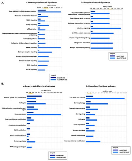 Comparative canonical and functional pathway analysis for a dataset of differentially expressed genes (≥1.5-fold; p < 0.05) following GALNT3 KO and GALNT3/T6 KO in A2780s cells. (A) (a) Comparison analysis of downregulated canonical pathways; (b) comparison analysis of upregulated canonical pathways. Top functions that meet a Holm–Bonferroni multiple testing correction p-value of 0.05 are displayed. (B) (a) Comparison analysis of downregulated functional pathways; (b) comparison analysis of upregulated functional pathways. Top functions that meet a Holm–Bonferroni multiple testing correction p-value of 0.05 are displayed. The bar-charts represent significance of gene enrichment for any given pathway with scores of 2 < z-score < −2.
