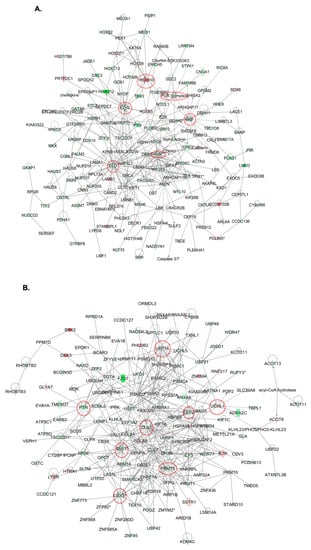 Common IPA networks obtained upon merging the five top-scoring networks following both GALNT3 KO and GALNT3/T6 KO were indicative of gene nodes with altered expression succeeding the suppression of these GalNAc-T enzymes in EOC cells. As shown in Figure 5A, GALNT3 KO led to a strong downregulation in gene nodes known to be implicated in EOC tumorigenesis, including VEGF, PI3K complex, and members of the PRC2 complex. Likewise, the top five common IPA networks following GALNT3/T6 suppression were indicative for the downregulation of major gene nodes reported to have important implications in EOC progression, including BMI-1 and members of the PRMT family, in addition to gene nodes showing great promise as EOC therapeutic targets, such as CUL1, PTN, CBX5, and USP14 (Figure 5B).
