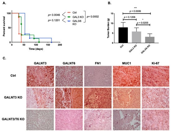 Moreover, there were no significant differences in the tumor burden between mice injected with Ctrl cells and GALNT3 KO cells (p = 0.1206), reaching an average tumor mass of 7.9 g (+/−0.83 SEM), compared with 5.8 g (+/−0.59 SEM), respectively (Figure 6B). In comparison, mice injected with the GALNT3/T6 KO cells displayed significantly smaller tumor masses when compared with both the Ctrl and GALNT3 KO groups (p = 0.0006 and p = 0.0205 respectively), with a mean residual tumor mass of 3.1 g (+/−0.5 SEM) at the endpoint (Figure 6B). These mice were euthanized due to general loss of wellness associated with disseminated disease (particularly in the liver), rather than overall tumor burden.
