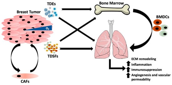 The underlying mechanisms that dictate the organ colonized by breast cancer are complex and influenced by many factors. Breast primary tumors regulate and prime the lung for metastasis by the secretion of tumor-derived exosomes (TDEs) and tumor-derived secreted factors (TDSFs), which target the bone marrow for recruitment of bone marrow-derived cells (BMDCs) to lung in order to induce changes in the extracellular matrix (ECM) that are conducive for metastasis. Release of TDSFs from the primary tumor are often regulated by stromal cells that compose the tumor microenvironment including cancer associated fibroblasts (CAFs) or environmental stimuli such as hypoxia.