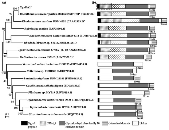 (a) Protein dendrogram of XynRA2 and its close homologs. The signal peptide sequences of the proteins were not included in the phylogenetic analysis. Asterisks (*) denote xylanases which have been characterized, otherwise represent genome annotated xylanases. (b) Schematic domains arrangement of the respective proteins identified by InterPro. Dotted-line box represents the truncated region in XynRA2ΔCBM.