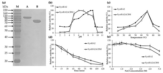 Molecular properties of purified XynRA2 and XynRA2ΔCBM. (a) SDS-PAGE analysis of purified XynRA2 and XynRA2ΔCBM. M, BenchMark™ Protein Ladder; A, purified XynRA2; B, purified XynRA2ΔCBM; (b) effect of pH in the range of 2–11; (c) effect of temperature from 20–90 °C; (d) thermostability at 70 °C across 120 min; (e) effect of NaCl from 0–5.0 M concentration.