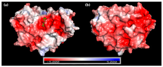 Predicted electrostatic potentials on the surface of XynRA2 catalytic domain from (a) top and (b) bottom views. The ligand (xylobiose) is bound at the catalytic binding pocket of XynRA2 as indicated in (a). Red and blue indicate negative and positive electrostatic potentials respectively.