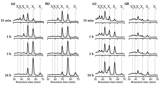 Product analysis of xylan degradation. (a,b) products formed from hydrolysis of beechwood xylan by XynRA2 and XynRA2ΔCBM, respectively; (c,d) products formed from hydrolysis of oat-spelt xylan by XynRA2 and XynRA2ΔCBM, respectively. The product peaks shown in this figure were normalized.
