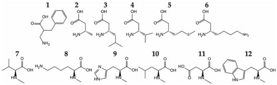 - Hartman, M.C.; Josephson, K.; Lin, C.W.; Szostak, J.W. An expanded set of amino acid analogs for the ribosomal translation of unnatural peptides. PLoS ONE 2007, 2, e972. [Google Scholar] [CrossRef]
