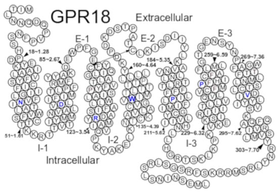 Helix net of the human GPR18 sequence. Among class A GPCRs, the most highly conserved residue in each helix is colored blue. GPR18 has a proline at P3.36, it lacks the highly conserved proline at position 7.50, bearing a valine at that position instead. A key disulfide bridge between the extracellular loop 2 (EC-2) and the top of TMH3 is indicated by a double headed arrow. Black arrowheads indicate specific residue numbers in the GPR18 sequence (absolute and Ballesteros-Weinstein numbering).