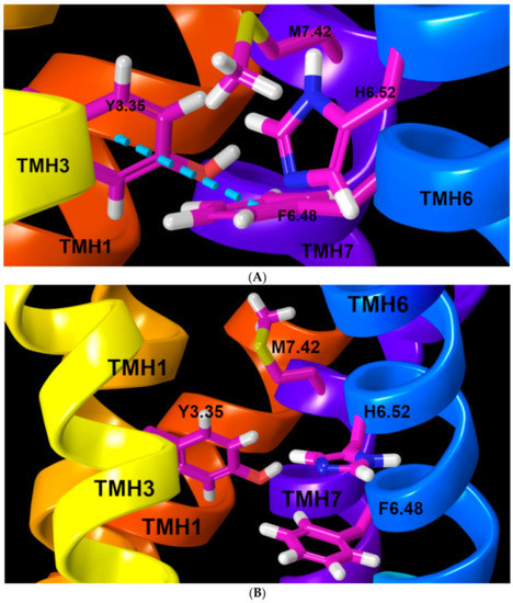 A second key structural feature is the “toggle switch”. The toggle switch is a pair (trio or quartet) of residues, one of which is W/F6.48 (of the CWXP flexible hinge motif) and the other(s), is (are) typically an aromatic or bulky residue that forms an interaction or stack with W/F6.48, stabilizing it in a χ1 = g+ conformation. In GPR18, the toggle switch is formed by F6.48, M7.42, and H6.52 and Y3.55 (see Figure 2A). When an agonist enters the GPR18 binding pocket, it triggers a F6.48 χ1 change from g+ to trans. This conformational change straightens TMH6 and breaks the ionic lock. Since antagonists/inverse agonists stabilize the inactive state of the receptor, an antagonist/inverse agonist should block the F6.48 χ1 transition from g+ to trans, thus keeping GPR18 in its inactive state. The highly conserved F6.44XXCWXPXF6.52 motif is replaced by V6.44XXCFXPXH6.52 in GPR18. Moreover, the lack of a bulky residue, like M3.36 (in GPR55), or a F3.36 (like CB1 and CB2) [25] directly across from F6.48 makes it difficult to control the toggle switch in GPR18. Since there is a P3.36 at this position, there is a lot of room for F6.48 to change its χ1 conformation from g+ to trans.