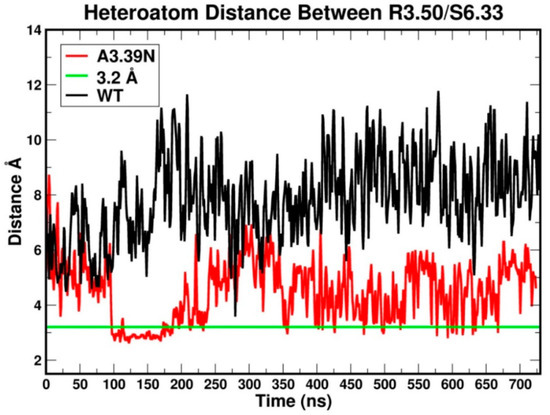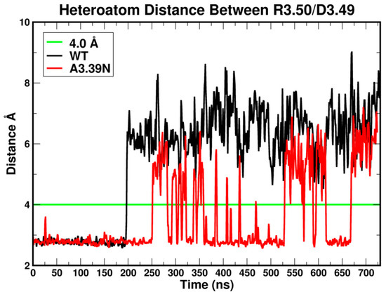 It has been proposed that in the inactive state of class A GPCRs, R3.50 is located in an “arginine cage,” in which it forms an intra-helical salt bridge interaction with D3.49 [29]. Figure 5 illustrates plots of the heteroatom to heteroatom distance between R3.50 and D3.49 for WT GPR18 (black) and the A3.39N mutant (red) [28]. The green line at 4.0 Å marks the maximum heteroatom-to heteroatom salt bridge distance. This plot shows that an R3.50-D3.49 salt bridge exists for a large amount of time for the mutant, but this salt bridge exists for WT until 200 ns and is thereafter broken.