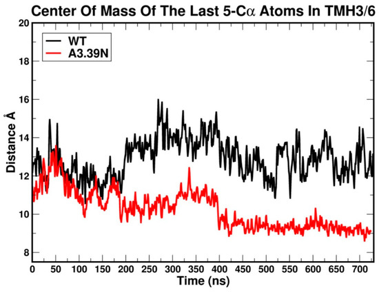 These results suggest that the A3.39N mutant receptor has a more stabilized arginine cage than WT. Since R3.50 has to be in a specific position in the arginine cage to interact with D3.49, this position may promote R3.50′s ability to also hydrogen bond to S6.33. Figure 6 shows a plot of the average distance between Cα atoms of the last five residues on the cytoplasmic side of TMH3 and of TMH6 for WT (black) and the A3.39N mutant [28]. As depicted in Figure 6, the distance of the centers of mass of the last five cytoplasmic end residues of TMH3 (residues Y3.51 to V(124)) and TMH6 (residues K6.30 to I6.34) clearly reveals that in the A3.39N mutant receptor, the cytoplasmic ends of TMH3 and TMH6 are closer during the course of the trajectory than those of the WT receptor. In fact, after 200 ns, the bottom of the WT receptor appears to be opened, suggesting that it has activated. The tendency of the WT receptor to have its ionic lock broken and the TMH3 and TMH6 IC ends to move away from one another is consistent with the very high constitutive activity reported for GPR18 [15].