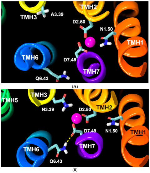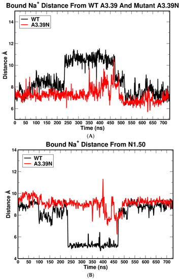 On the other hand, the distance between the Cα atom of N1.50 and the sodium ion increased in the A3.39N mutant (Figure 7B and Figure 8). Therefore, the sodium ion has moved towards the EC side in the A3.39N mutant. This is due to the hydrophilicity of residue N3.39, which contributes more in binding to the sodium ion than the WT hydrophobic residue (A3.39) would contribute. The sodium ion is pulled approximately 3.0 Å up towards the EC region of the receptor (Figure 8).