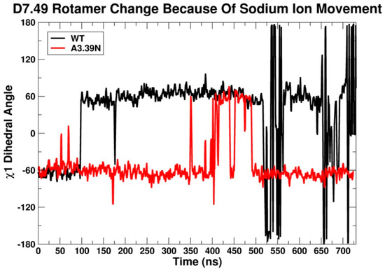χ1 rotamer conformational change in D7.49 in WT GPR18 (black) and the A3.39N mutant (red) due to sodium ion movement. The first 100 ns correspond to the equilibration phase. The next 600 ns are considered the production phase.