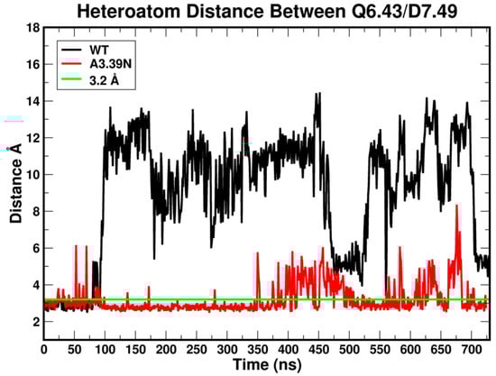 The graphs in Figure 11 compare the heteroatom to heteroatom distances for the Q6.43-D7.49 pair. As shown in Figure 11, during the equilibration (first 100 ns), the distance is small enough for a hydrogen bond to exist between the two residues in the WT receptor (black line). This corresponds to the time frame in which D7.49 changes its conformation (Figure 9, black line). Past 100 ns, the WT distance is too great for a hydrogen bond to exist. In contrast, this distance is frequently below the maximum for a hydrogen bond in the A3.39N mutant.