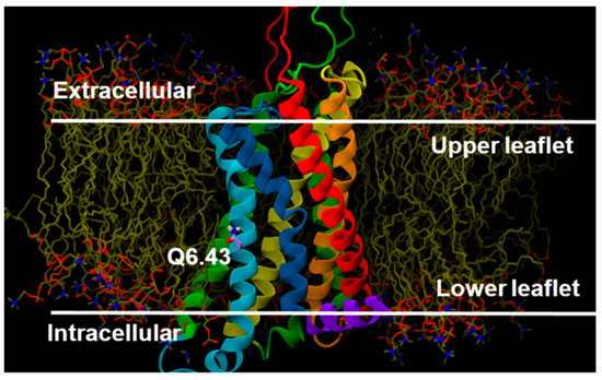 Our MD simulations show that there is a strong relation between the Q6.43 to D7.49 hydrogen bond and the R3.50 to S6.33 “ionic lock” interaction. Even though glutamines are neutral, polar residues, based on our GPR18 model, Q6.43 is positioned so that it faces the lipid side of TMH6 (Figure 12).