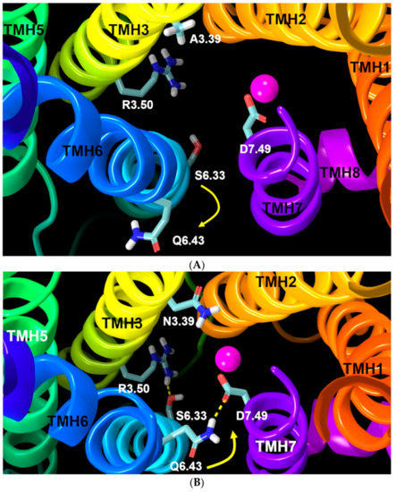 Conversely, in the A3.39N mutant receptor, formation of the Q6.43/D7.49 hydrogen bond causes a counter-clockwise rotation (from the top view) of TMH6. This rotation brings S6.33 close enough to R3.50 to form an “ionic lock” hydrogen bond (Figure 13B, Movie S3). These results are in agreement with the experimental data that shows very high constitutive activity for GPR18 and reduced constitutive activity for the A3.39N mutant [15].