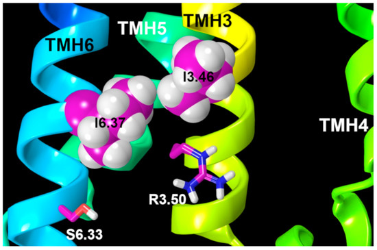 Further evidence of GPR18′s tendency to activate can be observed in the activated state model we developed. The first evidence is the quality of the ionic lock in GPR18, which is formed between R3.50 and S6.33. The ionic lock keeps TMH3 and TMH6 close at their IC ends and precludes G-protein interaction. In many other class A GPCRs, this interaction is formed between two charged amino acids, R3.50 and D/E6.30. Obviously, the interaction between a positively charged residue (arginine) and a negatively charged aspartic/glutamic acid is stronger than the interaction between the arginine and a polar neutral residue, like serine. Indeed, the “ionic lock” interaction in GPR18 is a hydrogen bond. Thus, it could be expected that this interaction in GPR18 could be easily broken. The second reason is the presence of bulky residues at the right top of the ionic lock. In the current GPR18 model, two isoleucines are located at the same level on TMH3 and TMH6 in the GPR18 bundle (see Figure 14). These residues may play an important role in the movement of TMH6. Several studies have suggested that residues at the relative positions of 3.46 and 6.37 play critical roles in GPCR activation [30]. Since these two residues are positioned above the ionic lock, the contacts between them might help to break the weak R3.50/S6.33 interaction in GPR18.