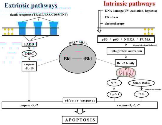 The extrinsic and the intrinsic pathways of apoptosis. The left side shows the extrinsic pathway and its mediating factors. The right side shows the intrinsic pathway and its activating mechanism. The grey area in the middle shows the controversial area of Bid proteins.