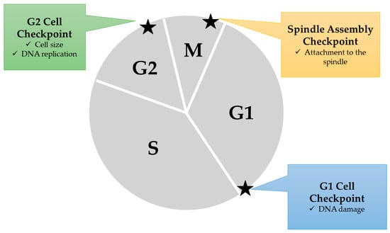 In cell cycle arrest, checkpoints play a crucial role in guaranteeing that the cell has completed the necessary procedures for each phase (Figure 3). There are mainly four checkpoints in the cell cycle that regulate the whole cycle. First, the G1/S checkpoint blocks cells whose DNA has been damaged. Second, the intra-S phase checkpoint blocks cells that have been impaired by genotoxic stress, but if delayed, the delay is only transient, compared to other checkpoints. Thirdly, the G2/M phase checkpoint blocks entrance into M phase if DNA replication is incomplete. Finally, the spindle checkpoint blocks entrance into anaphase of the M phase if the chromatids are not aligned on the mitotic spindle [,,,].