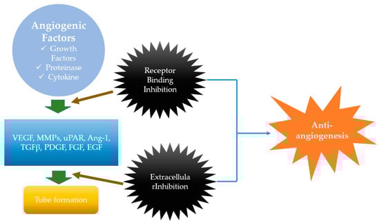 Angiogenesis mechanisms. Angiogenic growth factors induce the angiogenesis in tumor cells. This mechanism is usually mediated by factors such as VEGF (vascular endothelial growth factor), MMPs (matrix metalloproteinase), uPAR (urokinase receptor), Ang-1 (angiopoietin-1), TGFβ (transforming growth factor β), PDGF (platelet-derived growth factor), FGF (fibroblast growth factor), and EGF (epidermal growth factor). This leads to tube formation. However, during these processes, various inhibitions occur, such as receptor binding inhibition and extracellular inhibition. These lead to inhibition of angiogenesis, or, as mentioned in this review, “antiangiogenesis”.