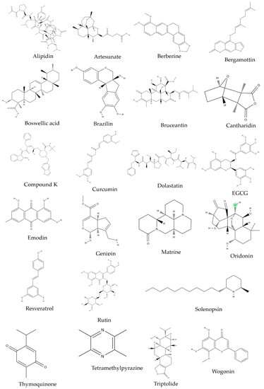 Bruceantin, derived from Brucea javanica, was examined to reduce all angiogenic parameters, including total branch length, total segment length, number of anchorage junctions, branches, segments, junctions, and nodes. The significant changes were induced at 12.5–50 nM []. Wogonin, an active monoflavone in Scutellaria baicalensis Georgi, was used in both in vitro and in vivo experimental settings. In in vitro experiments both protein and mRNA levels of VEGF expression were reduced. Furthermore, c-Myc and HIF-1a expression at protein levels were reduced. In in vivo experiments, expression levels of c-Myc, HIF-1a, VHL, and VEGF decreased, were observed in mice. Wogonin exhibited anti-MM activity without damaging the physiological functions of vital organs. Furthermore, combination therapy with bortezomib and lenalidomide induced further repression of MM []. Bergamottin, a natural furanocoumarin derived from grapefruit, exhibits potent antiangiogenic properties downregulating the levels of gene products regulated by STAT3, for example, COX-2, VEGF, cyclin D1, survivin, IAP-1, BCL-2, and Bcl-xL []. Solenopsin A, a primary alkaloid from the fire ant Solenopsis invicta Buren, showed antiangiogenic effects in in vitro and in vivo settings. Given that solenopsin A displayed antiangiogenic activities in in vitro experiments, the proliferation assay showed that solenopsin A inhibited cell proliferation and downregulated Akt levels. Since Akt is related to apoptosis and angiogenesis, this leads to further examination in in vivo experiments. In vivo studies showed that solenopsin A inhibits embryonic angiogenesis in zebrafish models. Distinct from other angiogenesis examinations, the vasculogenic vessels (dorsal aorta and posterior cardinal vein) formed appropriately in solenopsin-treated zebrafish embryos. This suggests that solenopsin may delay angiogenic precursors or sprouts from reaching their target []. Rutin–zinc (II) flavonoid complex, derived from Carpobrotus edulis (L.) N.E.Br., decreases VEGF and cyclin D1 expression levels, while upregulates the gene expression levels of caspase -3 and -8 []. Artesunate, a sesquiterpene lactone isolated from Artemisia annua Linn, exhibits angioenic activities in both in vitro and in vivo assays. When treated with artesunate, the number of vascular endothelial cells decreased, along with HUVEC migration. In in vitro assays, the density of vascular sprouts decreased, which was parallel to the decrease of the average number of vessels examined in in vivo assays [].