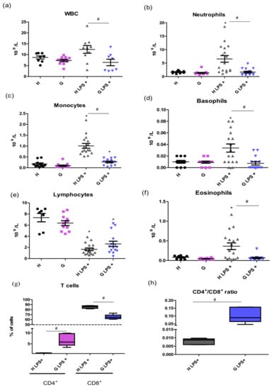 The effect of LPS-induced inflammation on WBC in hyperbilirubinemic Gunn rats. Total WBC cells (a) and their subpopulations (b–f) including T cells count (g) and CD4+/CD8+ ratio (h) were measured 12 h after LPS administration (6 mg/kg i.p.) in normobilirubinemic heterozygous controls (H or H LPS+) and hyperbilirubinemic Gunn rats (G or G LPS+), respectively. * p < 0.05 vs. corresponding control, # p < 0.05 vs. LPS-treated group. n = 8 animals per group (minimum).
