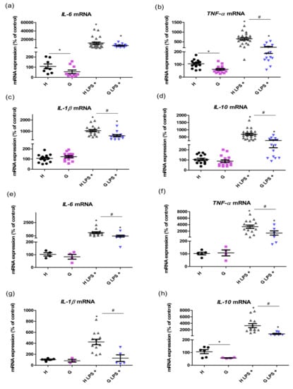 The effects of LPS-induced inflammation on mRNA cytokine expression in the liver and WBC of hyperbilirubinemic Gunn rats. mRNA expressions of pro- and anti-inflammatory cytokines IL-6, TNF-α, IL-1β, and IL-10 were measured in the liver tissue (a–d) and white blood cells (e–h) 12 h after saline or LPS administration (6 mg/kg i.p.) in normobilirubinemic heterozygous controls (H or H LPS+) and hyperbilirubinemic Gunn rats (G or G LPS+), respectively. * p < 0.05 vs. corresponding control, # p < 0.05 vs. LPS-treated group. n = 5 animals per group (minimum).