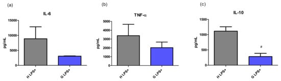 The effect of LPS-induced inflammation on cytokine concentration in serum of hyperbilirubinemic Gunn rats. Concentrations of pro-inflammatory cytokines IL-6, TNF-α, and anti-inflammatory IL-10 were measured 12 h after LPS administration (6 mg/kg i.p.) in normobilirubinemic heterozygous controls (H LPS+) and hyperbilirubinemic Gunn rats (G LPS+), respectively. # p < 0.05 vs. LPS-treated group. n = 5 animals per group (minimum).