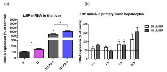 The effects of hyperbilirubinemia on lipopolysaccharide binding protein (LBP) mRNA expression in the liver tissues upon exposure to LPS (6 mg/kg i.p.) and in primary hepatocytes. mRNA expression of LBP was measured in the liver tissue (a) of normobilirubinemic heterozygous controls (H or H LPS+) and hyperbilirubinemic Gunn rats (G or G LPS+), respectively, and in primary hepatocytes (b). Primary hepatocytes isolated from Gunn rats were incubated with BR (20 and 40 µM) for 2, 4, 6, and 24 h. (b) Values are expressed as % of untreated control cells (100%). * p < 0.05 vs. controls, # p < 0.05 vs. LPS-treated group. (a) n = 12 animals per group (minimum); (b) n = 6 independent cell cultures per group.