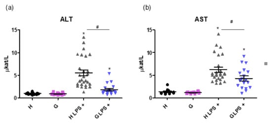 Importantly, markers of liver injury such as alanine transaminase (ALT) and aspartate transaminase (AST) activities were lower in the LPS-treated Gunn rats compared to in LPS-treated controls (1.87 ± 1.14 vs. 5.55 ± 3.32 µkat/L, and 4.28 ± 2.26 vs. 6.22 ± 2.88 µkat/L, respectively, p < 0.05 for both comparisons, Figure 5a,b).