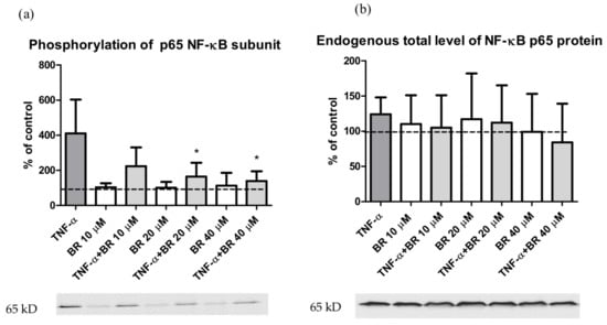 To examine the role of BR in regulation of NF-κB, a key mediator of inflammatory signaling, we investigated whether BR pre-treatment affects TNF-α-mediated NF-κB activation. Both types of primary hepatocytes were pre-treated with 10–40 µM BR and then exposed to TNF-α. As expected, TNF-α resulted in an increased phosphorylation of the NF-κB p65 subunit. Importantly, pretreatment with BR significantly decreased TNF-α-induced NF-κB p65 subunit phosphorylation (Figure 6a) (p < 0.05). No significant changes were detected in total levels of NF-κB p65 protein (Figure 6b), IKKβ protein, and inhibitor IκBα, as well as in phosphorylation of IKKα/β and IκBα after BR and TNF-α treatment (Figure S3). Interestingly, only BR itself increased phosphorylation of IKKα/β (Figure S3).