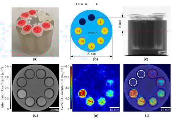 (a) The phantom used for concentration calibration; (b) The gadolinium (Gd) concentration (mg/mL) of each insertion; (c) An X-ray transmission image of the phantom (the red line denotes the axial slice used for the X-ray fluorescence computed tomography (XFCT) scan); (d) Reconstructed transmission computed tomography (CT) image; (e) Reconstructed XFCT image; (f) The CT and XFCT fused image (the red circles denote the sampling points of each insertion and the white circles denote the sampling points of the background).