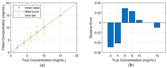 (a) Fitted line (r-square = 0.9989) and standard deviation about the calibration result; (b) Relative error of the fitted result.