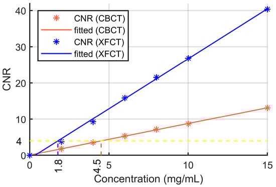 As XRF photons are only emitted from the target element, background tissues (water and PMMA) will not produce the fluorescent signal, which results in high sensitivity and contrast of XFCT. The contrast to noise ratio (CNR) of transmission CT and XFCT was calculated for quantitative analysis of the image performance (Figure 3). The linear relationship between CNR and the Gd concentration was also fitted by the least square method to estimate the detectability limit of transmission CT and XFCT. According to Rose criterion (CNR > 4) [33], the Gd detectability limit is about 1.8 mg/mL for XFCT and about 4.5 mg/mL for transmission CT in this work.