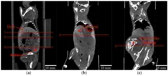 The sagittal plane of (a) the healthy mouse, (b) the mouse with a tumor transplanted at the liver and (c) the mouse with a tumor transplanted on the left leg. The red lines denote the axial slices that was chosen to perform XFCT imaging.