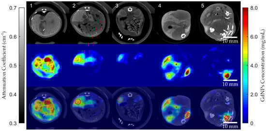The XFCT images of the five target slices after concentration calibration were obtained and are shown in Figure 5. The quantitative imaging results show that a large amount of GdNPs injected into the mouse were deposited in the liver according to blood circulation. It is noticed that there is also a small part of nanoparticles deposited in the kidneys (about 2 to 3 mg/mL) due to the metabolism. The fusion of transmission CT and XFCT images are also shown in Figure 5 for a more intuitive display of the deposition location.