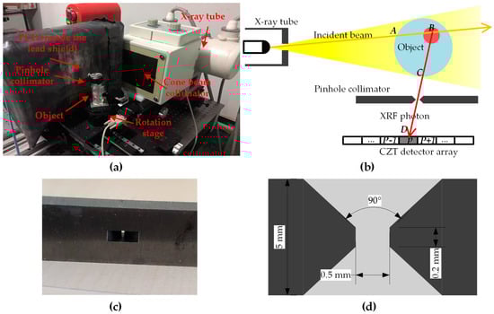 (a) The benchtop XFCT device; (b) The transport process of the X-ray fluorescence (XRF) signal; (c) The front view of the pinhole; (d) The cross section of the pinhole.