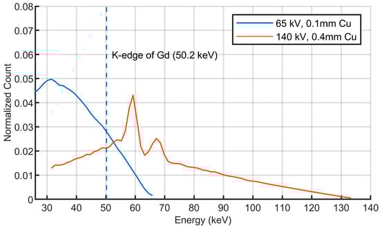 Incident spectrum for Cone-beam computed tomography (CBCT) (65 kV, filtered with 0.1 mm Cu) and XFCT (140 kV, filtered with 0.4 mm Cu) measured by eV-3500 detector.