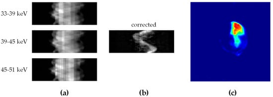 The XFCT image (Figure 8c) was reconstructed using the well-known MLEM algorithm [44]. The formula of each iteration can be expressed as follows: