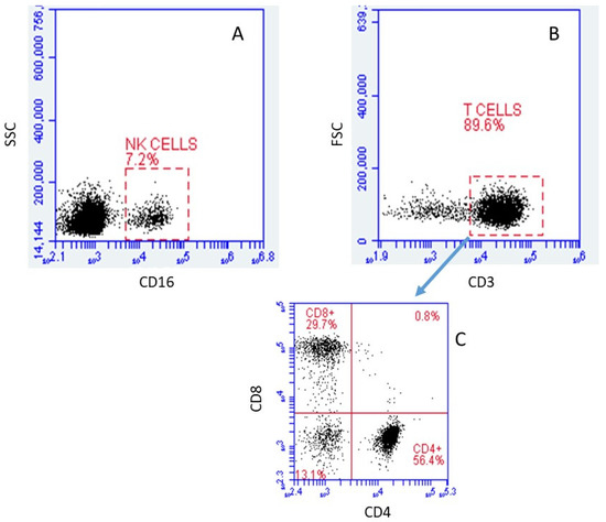 Immunophenotyping via flow cytometry analysis of cells obtained after T Cell enrichment by high affinity negative selection human T cell enrichment columns (SSC: Side scattering; FSC: Forward scattering). (A) Relative size vs. CD16 relative intensity, gated on CD45+. (B) Relative granularity vs. CD3 relative intensity, gated on lymphocytes. (C) CD8 vs. CD4 relative intensities, gated on T cells. Of the CD45+ population, 7.2% were positive for CD16, while 89.6% of the lymphocyte population was positive for CD3. Cells that were positive for CD4 or CD8 (but not both) accounted for 56.4% and 29.7% of CD3+ cells, respectively.
