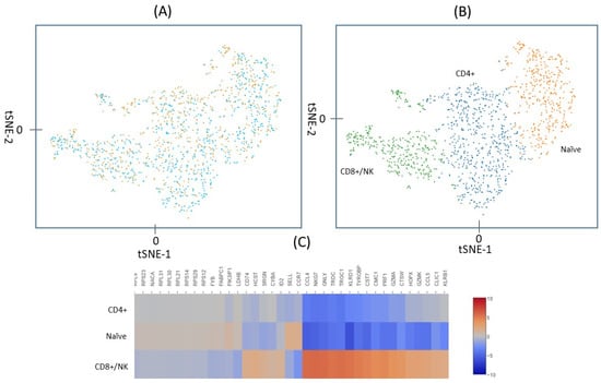 Of the 690 irradiated and 733 control cells, five from each treatment group had a total UMI >7000 and they were excluded from the analysis on the assumption that for these large UMI counts, more than one cell may have been captured and tagged as a single cell. The remaining 1413 cells, 685 irradiated and 728 controls, are plotted in Figure 2. Figure 2A shows the unsupervised t-Stochastic Neighbor Embedding (t-SNE) plot from the unbiased clustering of all irradiated and control cells that are based on the UMI in each of the genes in each cell. A graph-based hierarchical clustering algorithm was also used to separate the cells into three groups (three different colors) (Figure 2B). Heat diagrams, as shown in Figure 2C, were then used to identify predominant genes within each group. Cluster 3 is distinguished by expression of a set of genes, including CCL4, GNLY, CST7, PRF1, CCL5, which have been identified as signature genes for CD8+/NK cells [22]. Cluster 2 is characterized by the expression of CCR7 and SELL that are well-known marker genes for naïve cells [23,24]. The remaining cells that did not belong to cluster 2 or 3 were then predominately CD4+ cells (cluster 1). The total cell number of the clusters 1, 2, and 3 were 603, 412, and 398, respectively. After excluding 7.2% NK cells, the ratio of CD4+ to CD8+ cells found based on UMI values was about 2:1, which is similar to the ratio that is shown in Figure 1.