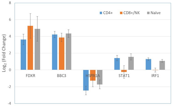 Fold changes of gene expression in selected genes after radiation exposure in the 3 clusters of CD4+, CD8+/NK, and naïve cells. FDXR and BBC3 were upregulated by radiation, whereas HSPA1A was downregulated, in all three groups. The upregulation of STAT1 and IRF1 was found in CD4+ and naïve cells, but not in CD8+/NK cells. Bars represent the standard error of the mean.