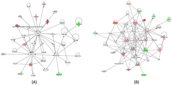 IPA analysis of the genes whose expressions were significantly altered when all cells were considered indicated that (A) TP53 is the primary response to radiation exposure in human T cells after 2 Gy gamma irradiation, and (B) activation of the STAT1/IRF1 signaling pathway in the irradiated cells.