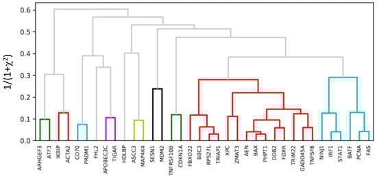 As a way of corroborating the IPA, we used a bivariate negative-binomial model [57] to quantify the dependence of UMI counts between each pair of genes, whose expression was significantly changed after irradiation. In addition, this analyses could identify the pairs of genes not previously known to be related, whose expression values are highly associated. More specifically, dependence was assessed in terms of a chi-squared statistic (χ2) after fitting the bivariate negative binomial regression model for each pair of genes. We then performed a non-supervised hierarchical clustering of the distance matrix with average linkage, where the distance function between the genes was defined as D = 1/(1 + χ2). Clustering was only performed on genes that were significantly upregulated.