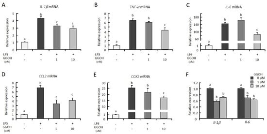Previously, we observed that the pretreatment of GGOH for 24 h suppressed LPS-induced interleukin-6 (IL-6) expression in differentiated THP-1 cells [23] Thus, in this study, we first examined whether GGOH treatments suppressed the expression of other proinflammatory genes induced by LPS in macrophagic THP-1 cells. The mRNA levels of the inflammatory cytokines interleukin-1β (IL-1β), tumor necrosis factor-α (TNF-α), and IL-6 were markedly increased 3 h after LPS treatment (Figure 1A–C). The cells pretreated with GGOH (10 μM) for 24 h before LPS stimulation showed significant suppression of the mRNA levels of these genes. However, we did not see effects on cell viability with GGOH treatment up to 10 μM (Figure S1). These results are consistent with our previous results [23]. Further, GGOH decreased the mRNA levels of C-C motif chemokine ligand 2 (CCL2) and cyclooxygenase-2 (COX2), which are regulated by NFκB (Figure 1D,E). However, treatment with GGOH simultaneously with LPS stimulation did not show suppressive effects on the expression of the proinflammatory cytokines. Pretreatment of murine macrophagic RAW264.7 cells with GGOH also suppressed LPS-induced Il-1β and Il-6 mRNA upregulation (Figure 1F). These results indicated that GGOH pretreatment suppressed LPS-induced inflammatory gene expression.
